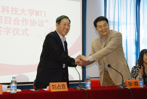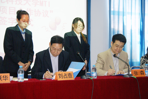 | 2016年4月21日下午,河北科技大學(xué)外國(guó)語學(xué)院院長(zhǎng)張森攜有關(guān)領(lǐng)導(dǎo)及師生30多人、我公司董事長(zhǎng)劉占查攜全體員工共計(jì)100余人,在公司多功能廳,就建立河北科技大學(xué)翻譯碩士研究生工作站項(xiàng)目成功簽約。會(huì)上,我公司董事長(zhǎng)劉占查發(fā)表了熱情洋溢的歡迎詞,對(duì)校方多年的鼎力支持表示感謝;河北科技大學(xué)外國(guó)語學(xué)院院長(zhǎng)張森就“建站”意義及校企雙方廣泛深度合作問題做了重要講話。 河北科技大學(xué)外國(guó)語學(xué)院副院長(zhǎng)崔麗、河北科技大學(xué)外國(guó)語學(xué)院研究生教研室主任霍月紅、河北科技大學(xué)外國(guó)語學(xué)院成教與培訓(xùn)辦公室主任杜之濤、河北科技大學(xué)外國(guó)語學(xué)院翻譯系教師秦永生、河北科技大學(xué)外國(guó)語學(xué)院翻譯系教師閆亞琳,我公司工會(huì)主席、綜合事業(yè)部主任尚躍華、編譯部主任強(qiáng)紅心出席了簽約儀式。