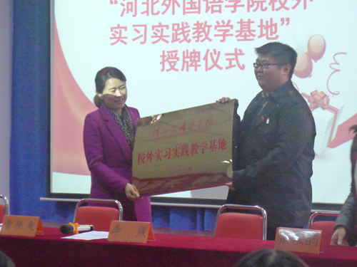 | 2016年11月15日,河北外國語學(xué)院日語學(xué)院行政院長李成、河北外國語學(xué)院日語學(xué)院業(yè)務(wù)副院長張桉菂、 河北外國語學(xué)院日語學(xué)院就業(yè)處處長田沙攜35名大學(xué)生來公司,首先進行了“河北外國語學(xué)院校外實習(xí)實踐教學(xué)基地”授牌儀式,公司總經(jīng)理曹艷爽、綜合事業(yè)部主任尚躍華、手冊編譯部主任強紅出席了授牌儀式。儀式上播放了公司宣傳片、《國超之歌》,強主任重點講解了手冊編譯部的主要業(yè)務(wù)情況,并帶領(lǐng)河北外國語學(xué)院日語學(xué)院領(lǐng)導(dǎo)及師生參觀了公司,并讓同學(xué)們參加了日語試譯活動,讓同學(xué)們體驗了工作的感覺。公司會為實習(xí)實踐的學(xué)生提供最好的機器設(shè)備和舒適、寬松、安全有序的實習(xí)和生活環(huán)境,會委派具有較高實踐經(jīng)驗和理論水平的人員參與實習(xí)指導(dǎo),確保學(xué)生實習(xí)實踐有良好的效果,為學(xué)生畢業(yè)后就業(yè)打下堅實基礎(chǔ)。