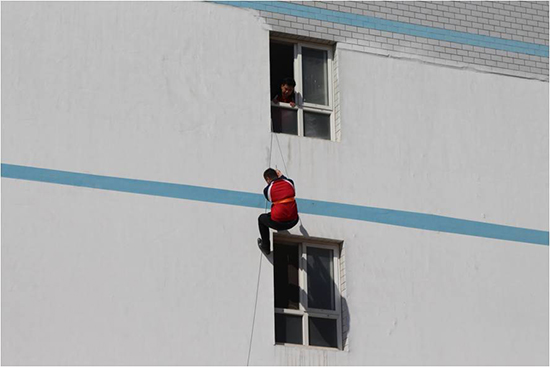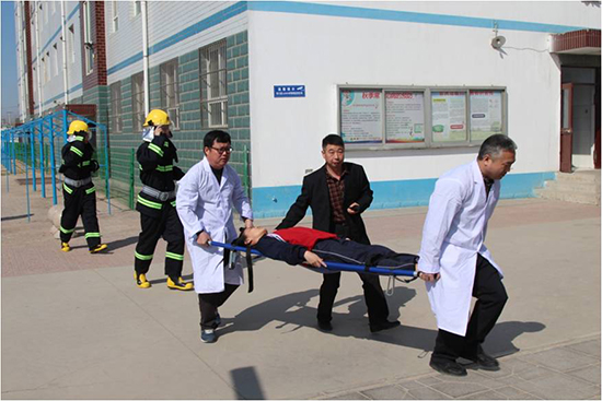 學(xué)校消防員接到火災(zāi)通知后迅速穿戴消防戰(zhàn)斗服及防煙面具,攜帶滅火器沖入火場(chǎng),處理初期火災(zāi)。因火勢(shì)太大,無(wú)法控制,通訊組匯報(bào)給校長(zhǎng),馮校長(zhǎng)立刻撥打了119火災(zāi)報(bào)警電話。得知一名同學(xué)昏迷,學(xué)校醫(yī)護(hù)人員迅速趕到宿舍樓,用擔(dān)架抬出昏迷學(xué)生,120急救人員立即進(jìn)行搶救。消防人員指導(dǎo)四樓被困學(xué)生用緩降器進(jìn)行自救,并派遣云梯車對(duì)樓頂學(xué)生進(jìn)行營(yíng)救。