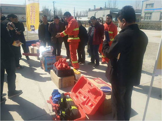 隨后河北國(guó)超消防設(shè)備科技有限公司提供消防器材展示,包含水基滅火器、25米鋼絲繩緩降器、自救呼吸器、應(yīng)急手電筒等設(shè)備,并由專業(yè)人員進(jìn)行講解。